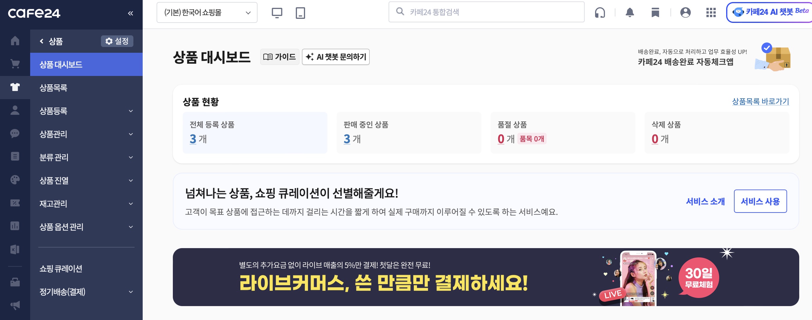 카페24 쇼핑몰 관리자에서 [상품] 카테고리로 들어가게 되면 상품 현황도 볼 수 있습니다.