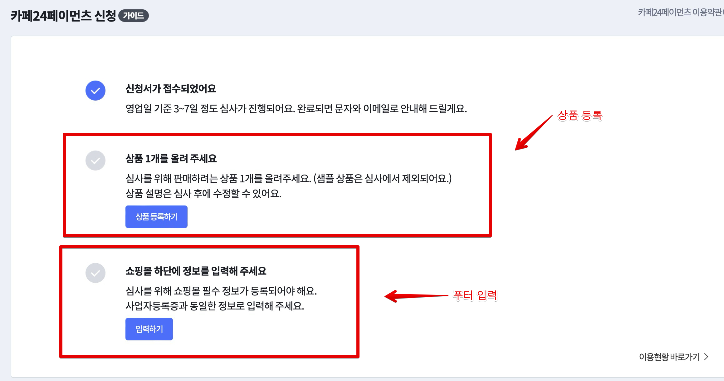 카페24 페이먼츠 신청 가이드에 따르면, 신청서 접수는 진행하였고요. 이제 2개의 단계가 더 남았는데 심사를 위해서 상품 등록하는 과정과 쇼핑몰 하단 푸터 정보 입력하는게 있습니다.