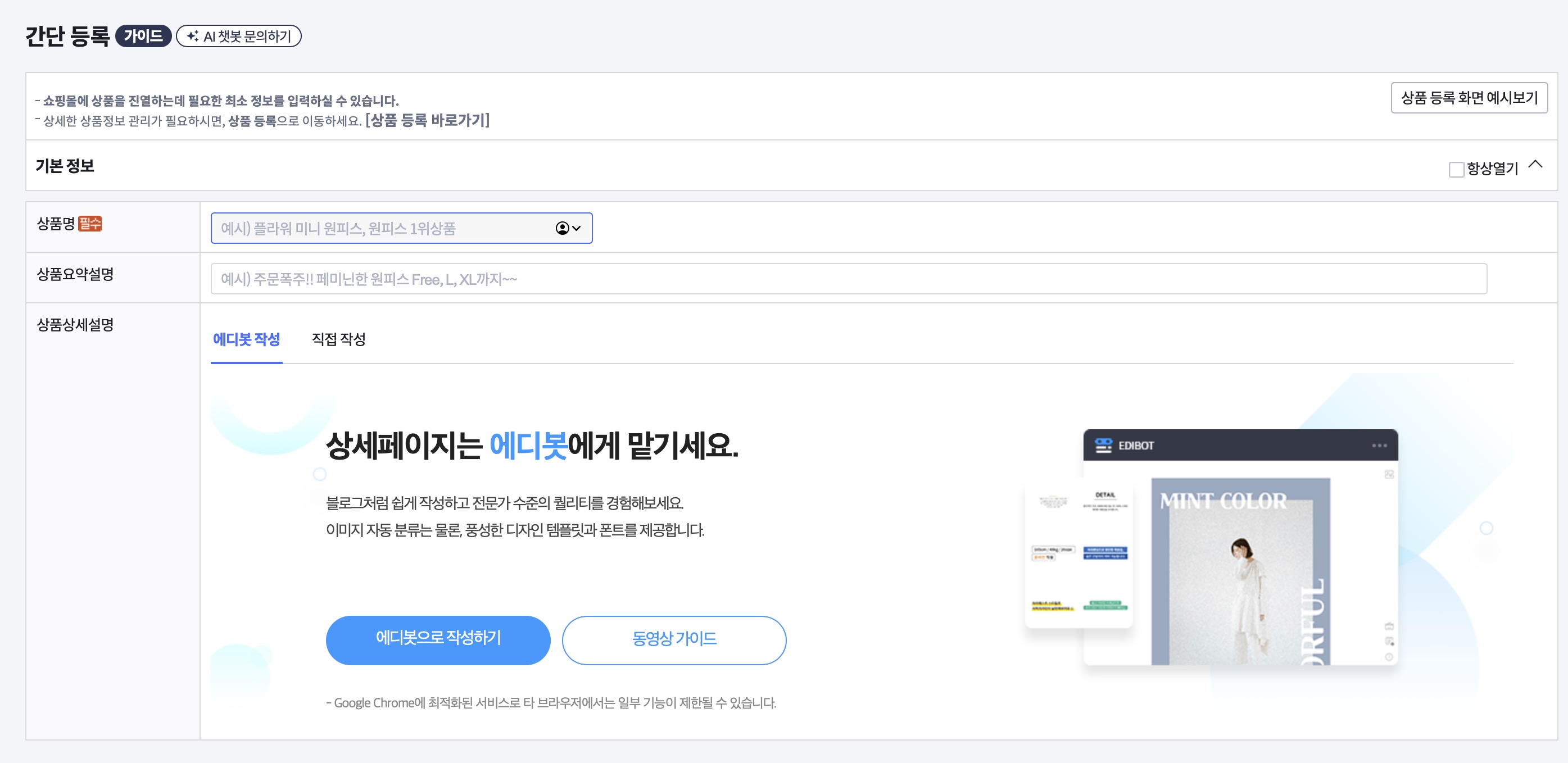 간단 등록에서 등록해주면 되는데요. 이때 등록을 할 때 [에디봇 작성]이 있고 [직접 작성]이 있어요. 에디봇 작성은 쉽게 말하자면, 간단하게 입력하는데 예쁘게 디자인이 나오는 템플릿이라고 보시면 됩니다.