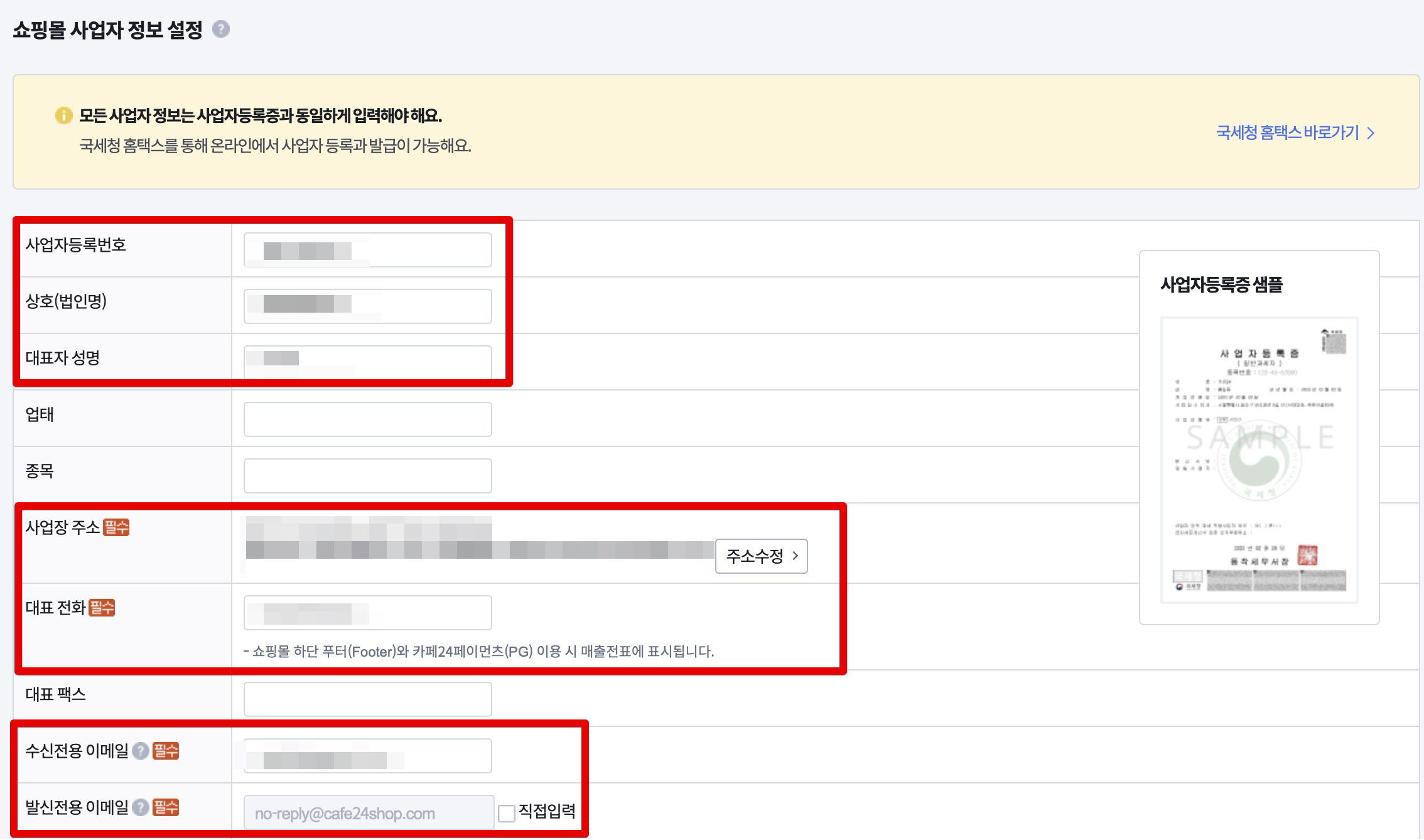 사업자등록 관련 정보도 넣어줍니다. 사업자등록증을 보면서 넣으시면 됩니다. 아래쪽에 대표전화와 수신전용이메일도 체크해주세요.