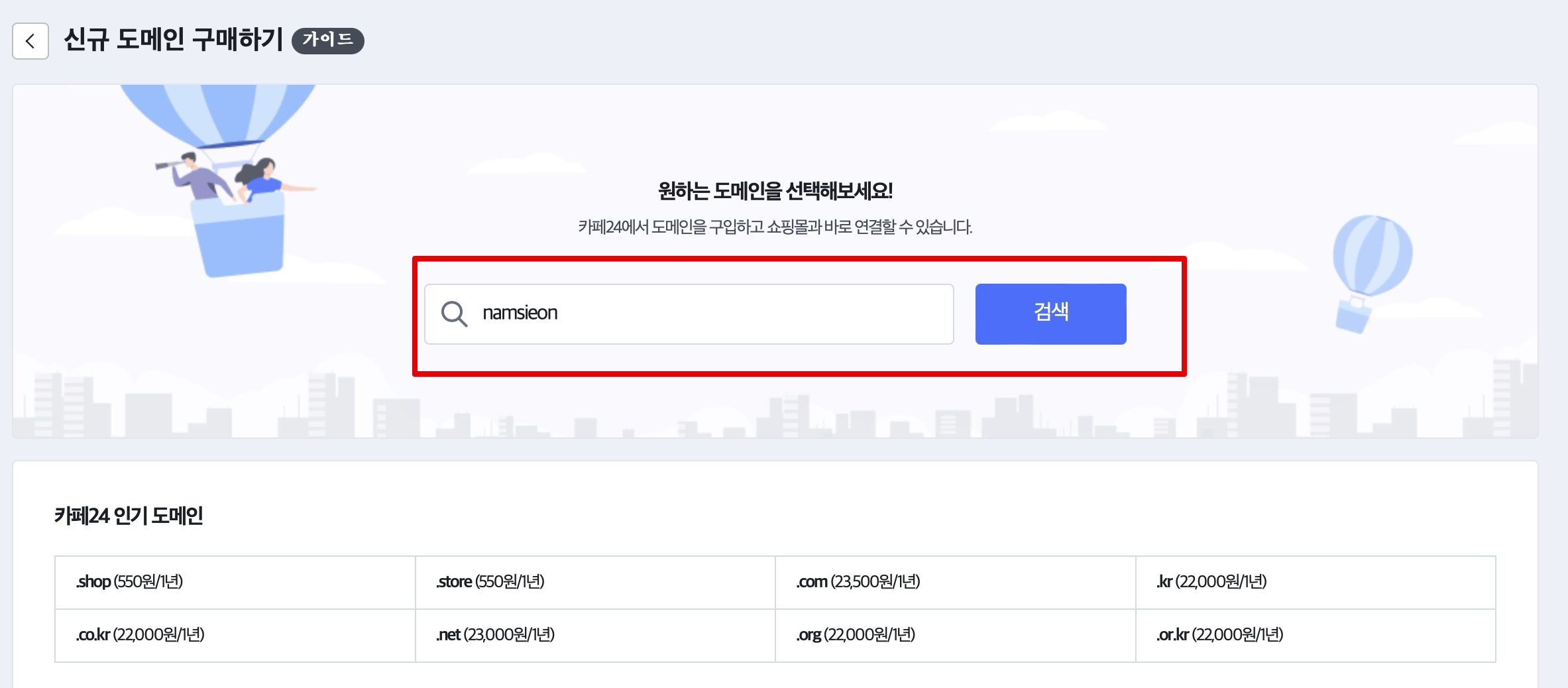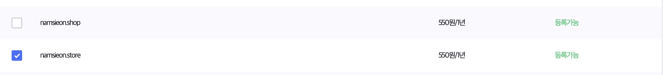아래쪽에 보시면 .shop 도메인은 1년에 550원, .store 도메인도 1년에 550원으로 아주 저렴하게 구매가 가능합니다. 저는 테스트로 namsieon.store 도메인을 550원을 내고 구매한 후 연결해보겠습니다.