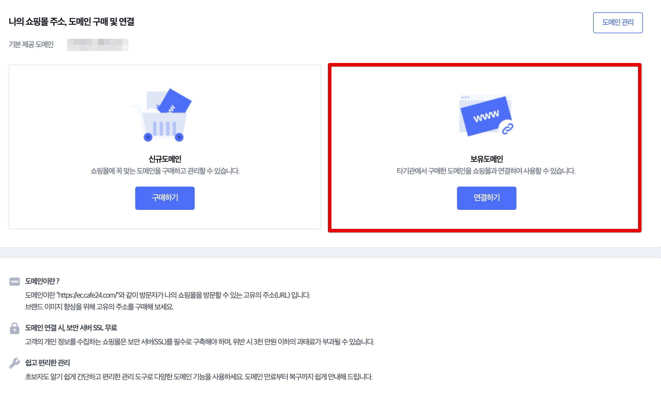 카페24에서 쇼핑몰을 처음 만들게 되면 기본 도메인으로서 쇼핑몰 주소는 카페24아이디.cafe24.com으로 설정됩니다. 이 주소를 그대로 사용해도 되겠지만, 일반적으로 이런 주소는 남들에게 보여주는 목적으로는 잘 사용하지 않으며 아이디가 공개되고, 전문성이 떨어져보이기 때문에 별도의 도메인을 구입하여 사용하는게 일반적입니다.