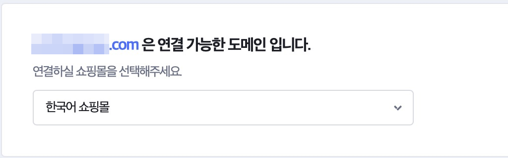 한국어 쇼핑몰로 선택하면 되며 연결 가능한 도메인이라고 나오면 됩니다. 저는 과거에 가비아에서 도메인을 몇 개 구입해둔게 있어서 그 도메인을 사용할 예정입니다.