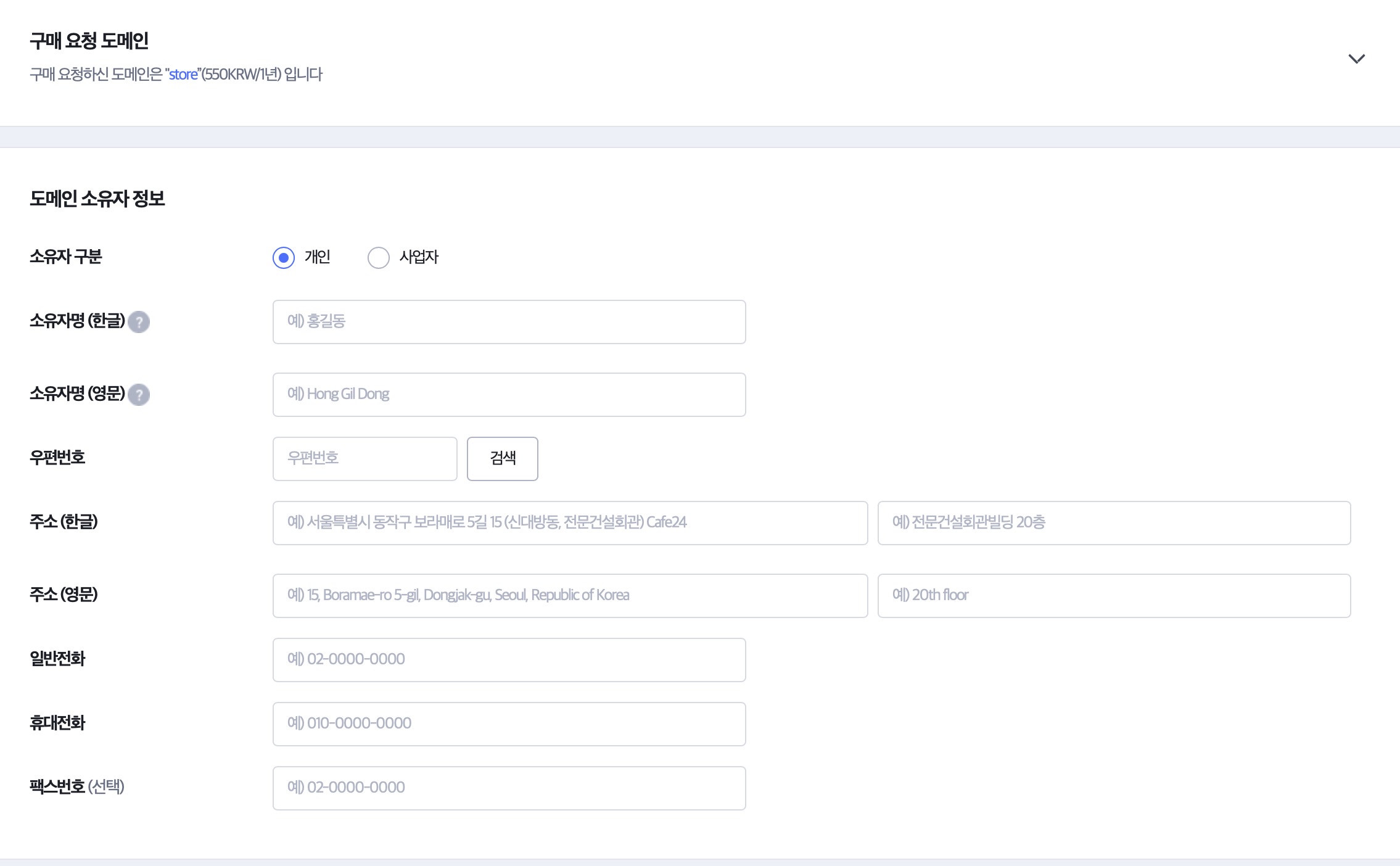 구매하기 버튼을 클릭하면 도메인 소유자 정보를 확인하는 창이 나오는데 이 부분이 중요하니 꼭 꼼꼼하게 적어주셔야합니다.
