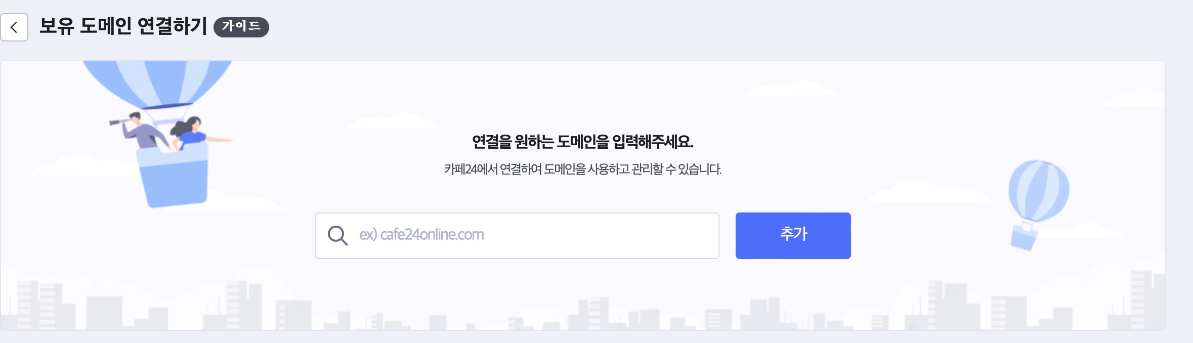 보유 도메인 연결하기 창으로 들어가게 되면 연결을 원하는 도메인을 입력하라고 나옵니다. 여기에서 자신이 보유하고 있는 도메인 주소를 입력해줍니다.
