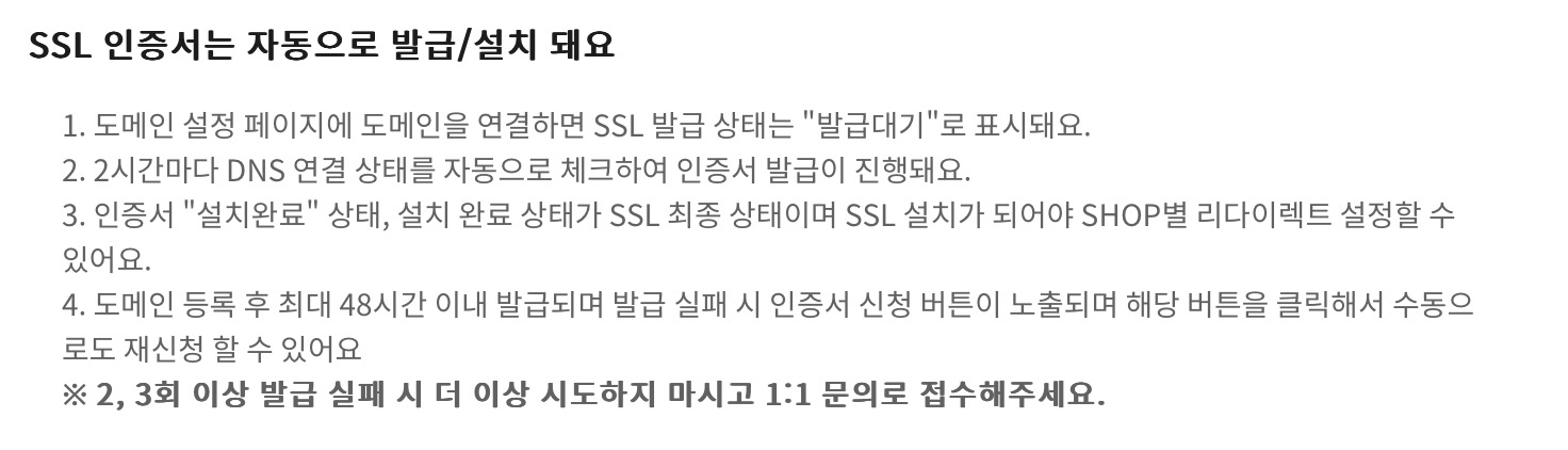 카페24 헬프센터 가이드에서도 도메인 구매 후 SSL 인증서는 자동으로 발급 및 설치되는데 2시간마다 DNS 연결 상태를 체크하고 인증서가 발급된다고 합니다. 따라서 도메인 구매 후 바로 연결이 안된다고 실망하지마시고 다음날 정도에 접속할 수 있으니까 구매 후 기다리시면 되겠습니다.