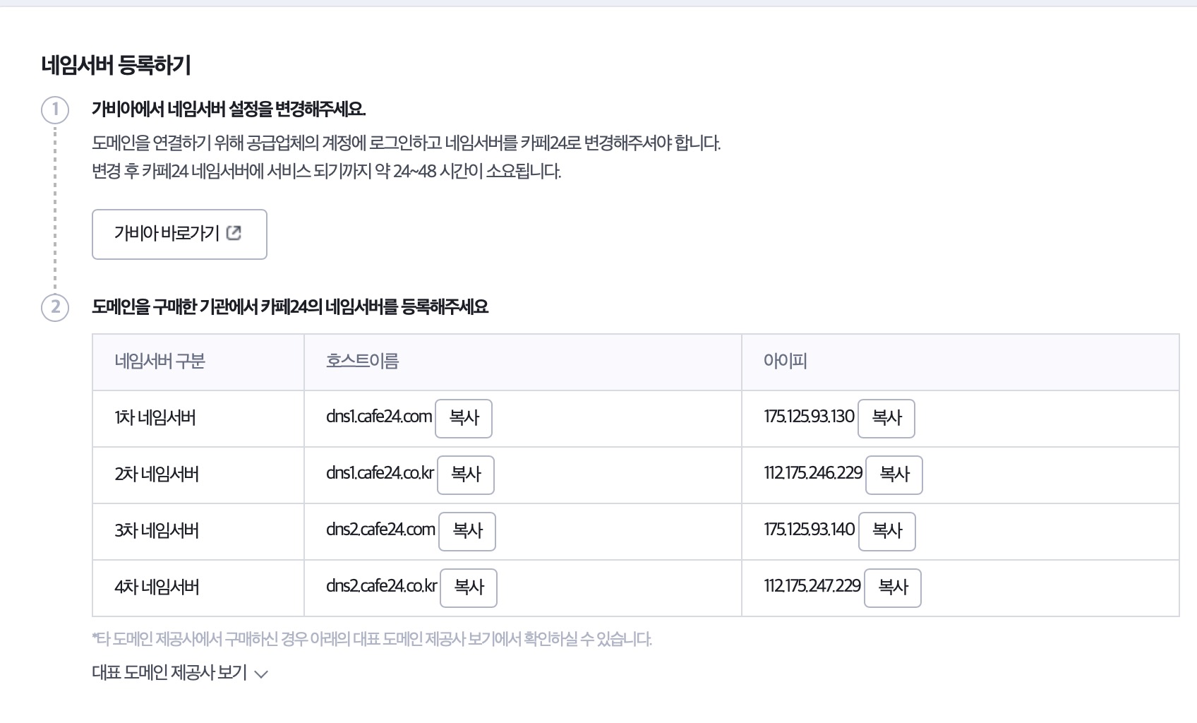 가비아 설정에서 네임서버를 변경해주어야합니다. 만약 도메인 구입 업체가 가비아가 아니라면 도메인 구매 업체의 설정에서 네임서버 설정해주시면 됩니다.