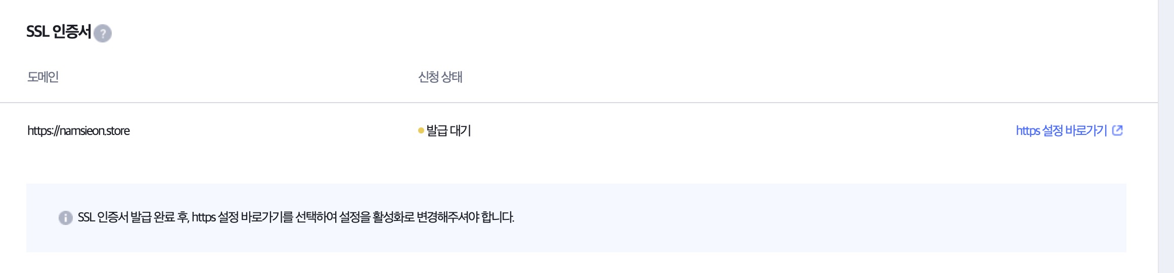 도메인관리로 들어가보면 SSL 인증서 발급까지도 시간이 소요됨을 확인할 수 있고 아직은 발급 대기 상태인걸 볼 수 있습니다. 최대 48시간이 소요될 수 있습니다.