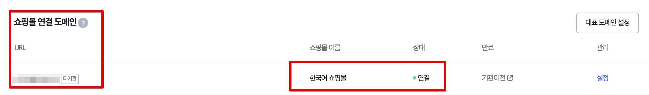 입력해주고 카페24 쇼핑몰관리자 화면에서 다시 도메인 설정 창을 확인해보면, 내가 등록한 도메인이 보이며 '타기관'이라는 태그도 보입니다. 그리고 상태에서 연결이 된다고 되어 있어야합니다.