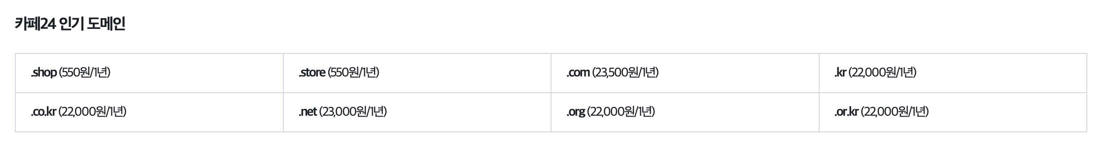 카페24에서 쓸 수 있는 도메인들입니다. 제일 저렴한 .shop의 경우 1년에 550원으로 굉장히 저렴한 편이며 .store도 있습니다. 일반적으로 많이 쓰이는 도메인은 .com과 .co.kr 정도이며 .com은 23,500원 정도, .co.kr은 22,000원 정도인데 개인적으로는 .com을 권장합니다. 이 블로그를 포함해서 저희가 가지고 있는 모든 도메인이 .com만을 사용하며 .com이야말로 사용자들에게 가장 익숙한 도메인입니다.
