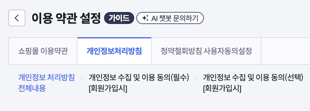 이용약관설정으로 들어가면 [쇼핑몰 이용약관]과 [개인정보처리방침]이 뜨는데 두 가지 모두 수정해주어야할 대상입니다.