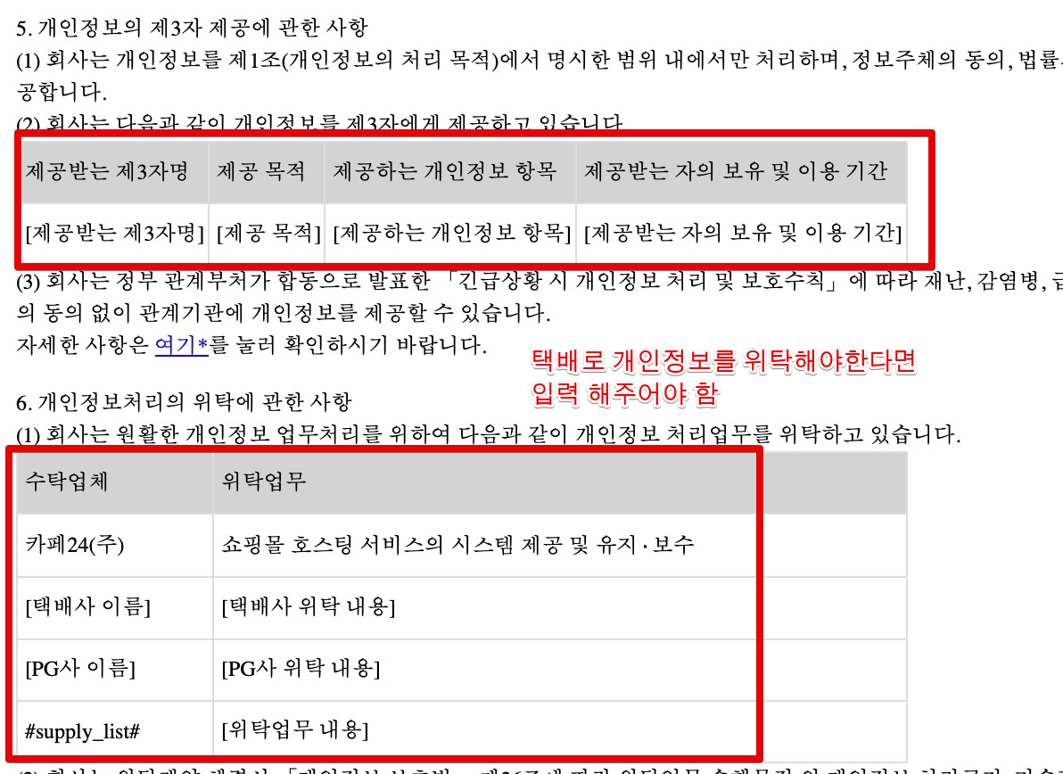다음으로 개인정보를 제3자에게 제공하는 항목이 있는데 만약 택배를 통해 상품을 발송해야하는 재화를 판매할 경우, 택배사 등을 상세하게 나열해주어야합니다. PG사 이름은 카페24페이먼츠, 토스페이먼츠이고요.