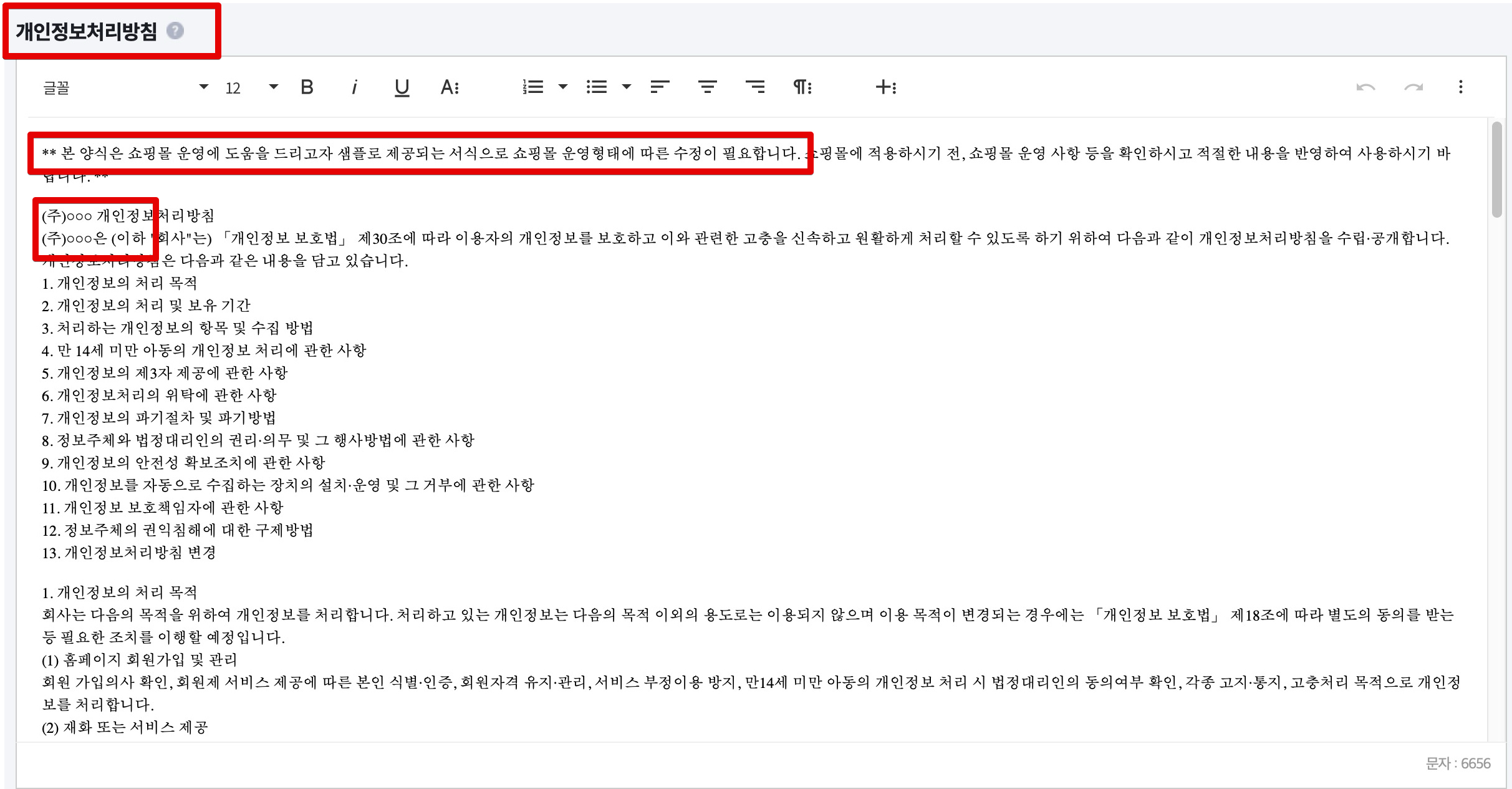 다음으로 개인정보처리방침으로 들어가서 수정해줍니다.