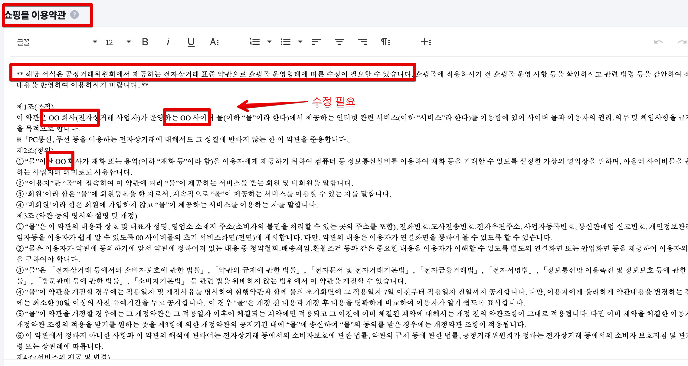 이용약관부터 수정해주는데요. 이용약관의 경우 처음에 공정거래위원회에서 제공하는 전자상거래 표준 약관이 들어가 있고, 수정해주어야할 부분들이 꽤 있습니다. 여기에서 읽어보시면서 필요한 부분들을 모두 수정해줍니다. 제일 아래쪽에 날짜도 최신화해주시고요.