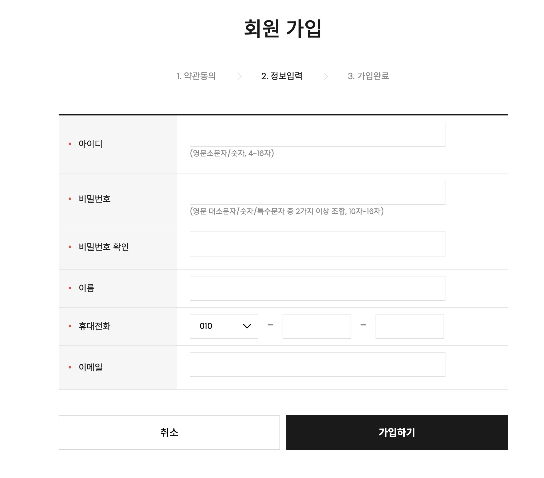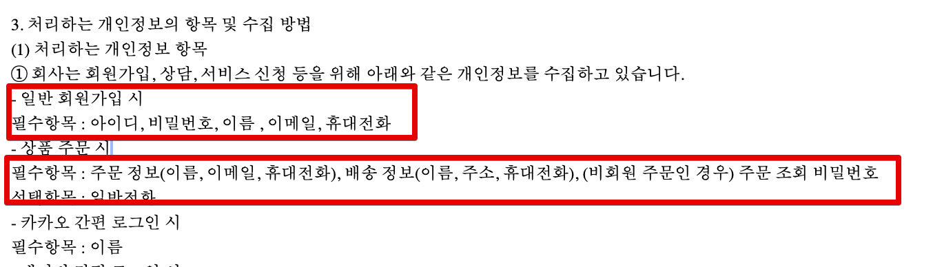 예를들어서 지금 저희 자사몰의 경우 회원가입시 불필요한 정보는 받지 않으며(예를들어 주민등록번호나 주소 등), 꼭 필요한 정보들만 받고 있습니다. 아이디와 비밀번호, 이름, 휴대전화, 이메일 주소를 받는데요. 이때에는 개인정보수집에서도 똑같이 적어주시면 됩니다.