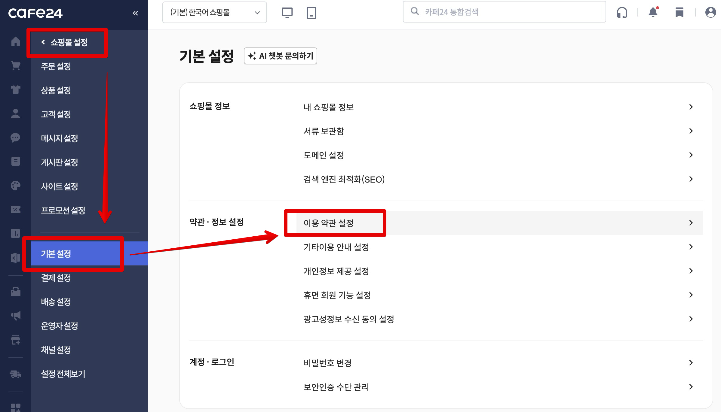 일단 제일 먼저 카페24 쇼핑몰 관리자 화면에서 [쇼핑몰 설정] - [기본 설정] - [이용 약관 설정]으로 들어갑니다.