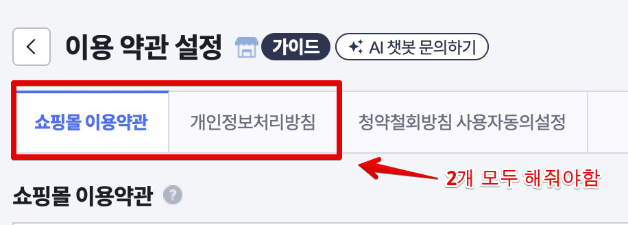 이제 쇼핑몰에서 쓰는 이용약관과 개인정보처리방침을 설정해줄 차례입니다.