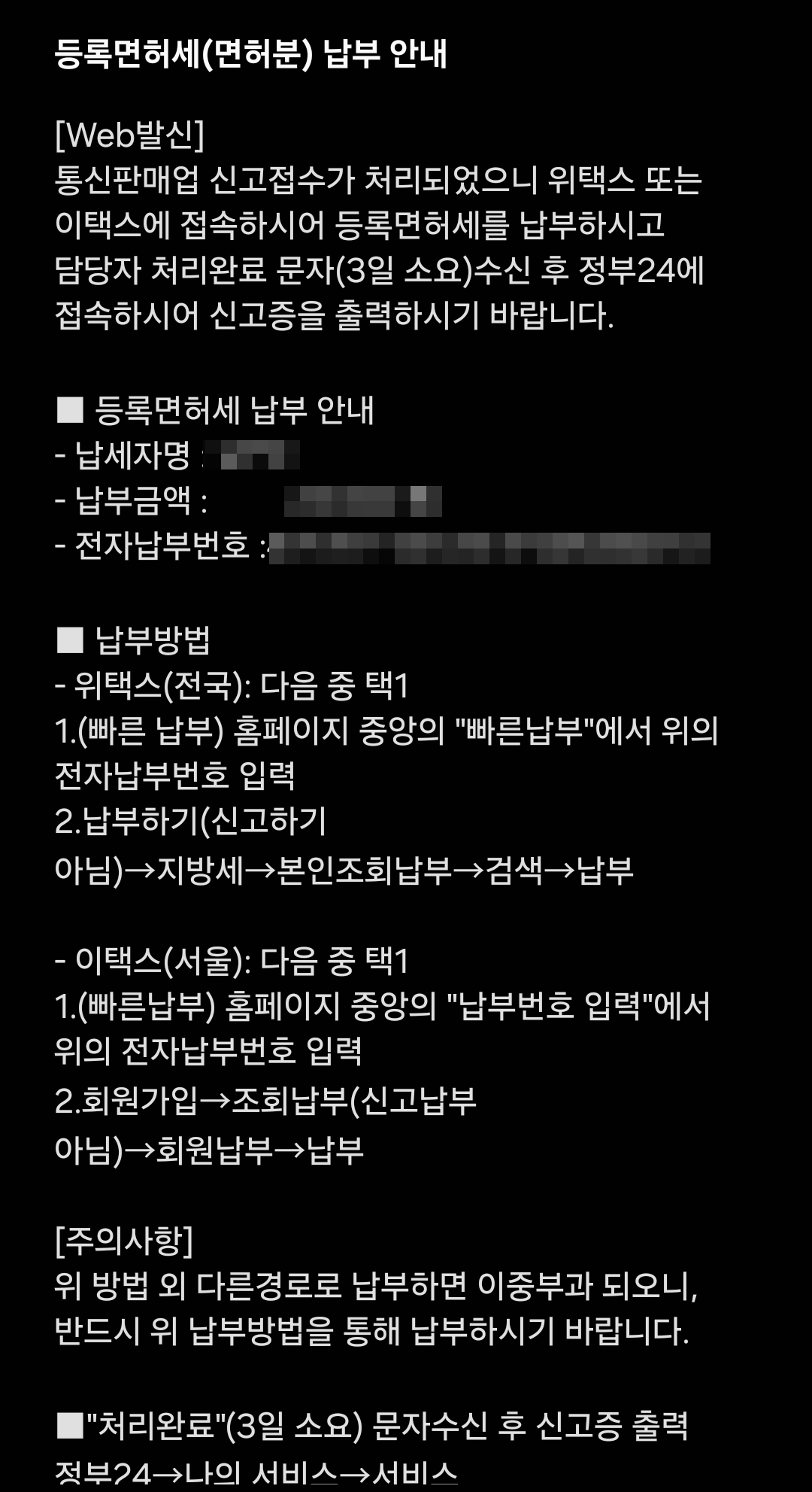 제일 처음 통신판매업 신고를 하게 되면 신청이 완료되면 위와 같은 문자 안내가 옵니다. 등록면허세를 납부하라는 안내문자이고요. 납부 방법에 대해서 자세히 설명이 돼 있는데 서울지역이 아닐 경우 스마트폰에 있는 위택스 앱으로 납부하면 됩니다.
