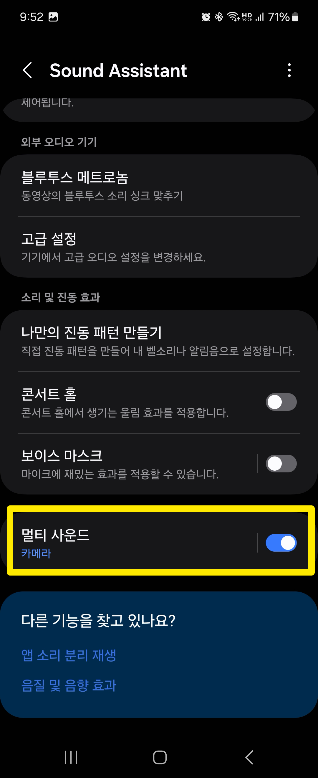 설치 후 Sound Assistant 앱을 실행하고 제일 아래쪽으로 내리면 멀티 사운드라는 항목이 있는데 이걸 켜주고요. 그리고 클릭해서 카메라를 등록해줍니다.