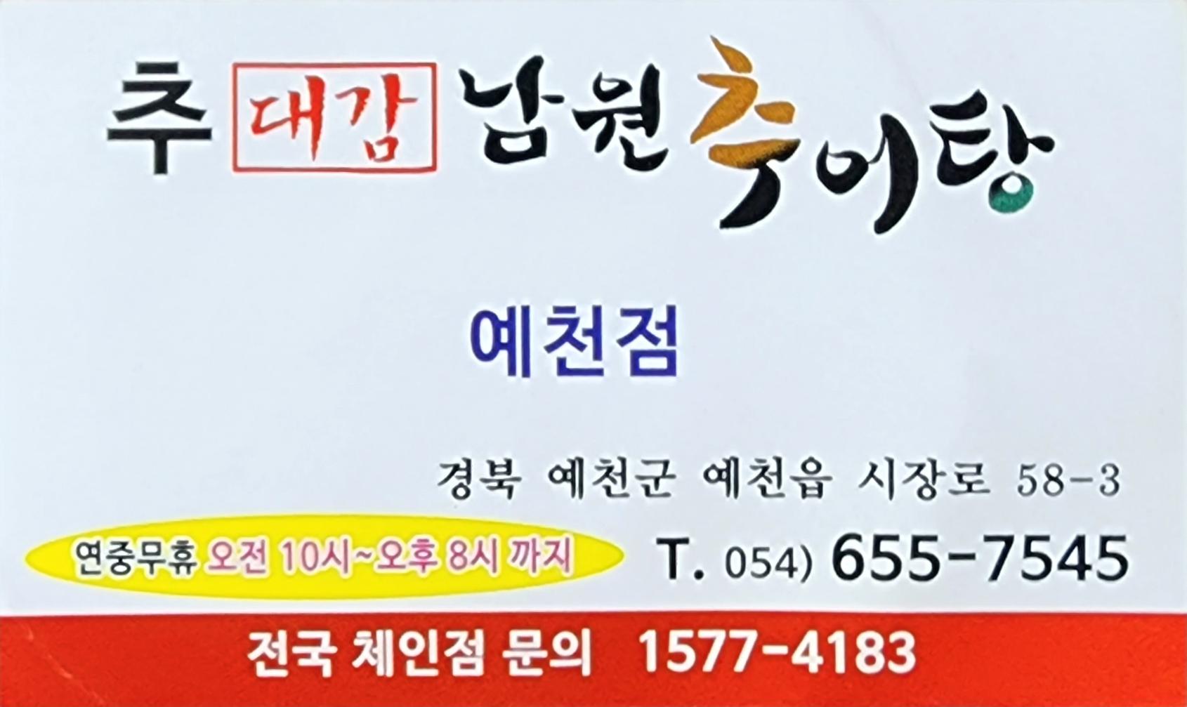 더불어 추대감 남원추어탕 예천점도 있으니 참고해주세요. 메뉴는 동일하며 안동에서는 정상동점, 예천에서는 예천점으로 가시면 되는데요.