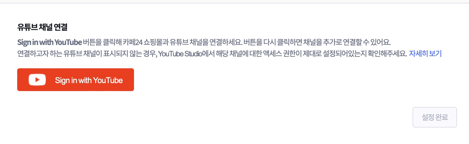 제일 먼저 카페24 유튜브 쇼핑 메뉴에서 유튜브 채널을 설정하고 연동해주어야합니다.