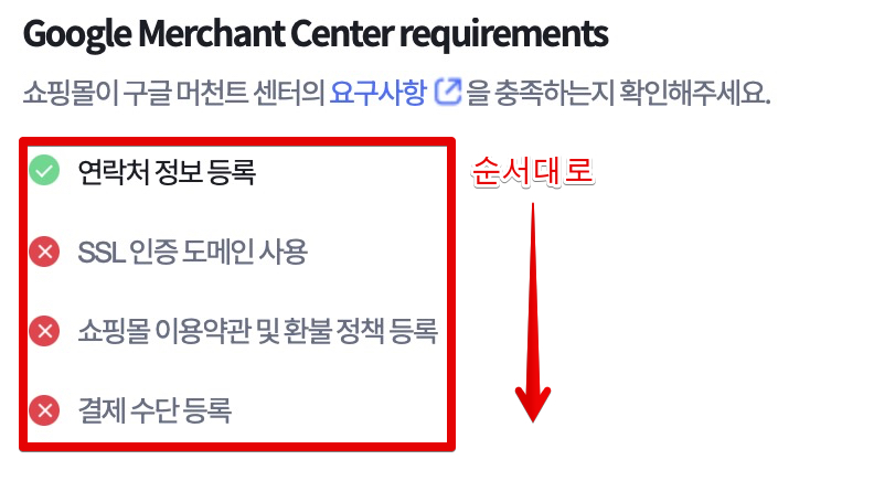 다음으로 구글 머천트 셑어 요구사항을 충족해야합니다. 위쪽에서부터 순서대로 아래로 내려가면서 설정해주면 됩니다.