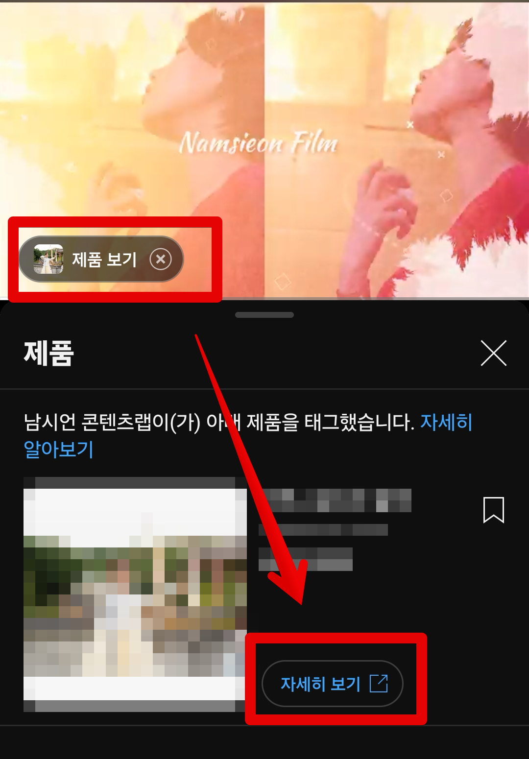 유튜브 영상에서 [제품 보기]를 클릭하게 되면 유튜브 쇼핑에 연동된 상품이 나타나게 되며 여기에서 [자세히 보기]를 클릭하면 쇼핑몰로 연결됩니다.