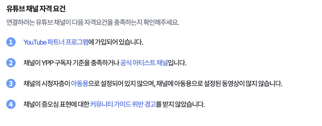 여기까지 한다음에 카페24 쇼핑몰 관리자 화면에서 [판매 채널] - [유튜브쇼핑]으로 들어가게 되면, [판매자 센터 설정]란이 있는데 여기에서 확인해보아야할 것은 유튜브 채널 자격 요건입니다. 저 4가지 모두 달성이 되어 있어야합니다.
