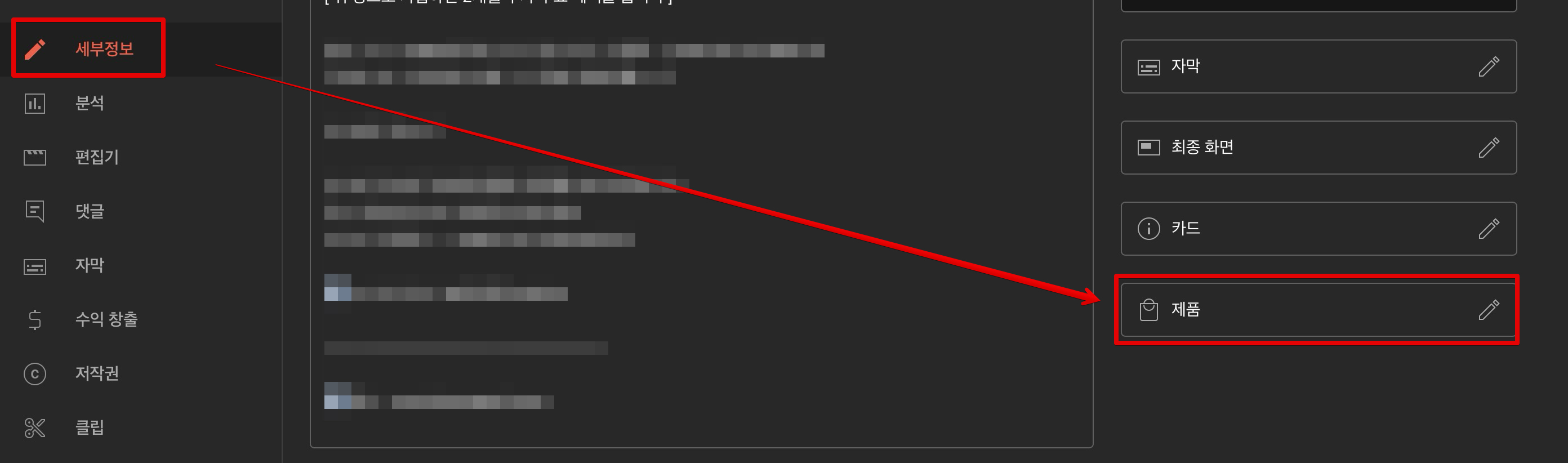 유튜브 동영상을 수정을 들어간 다음 [세부정보]를 클릭해보면 오른쪽에 [제품]탭이 있습니다. 여기를 클릭합니다.