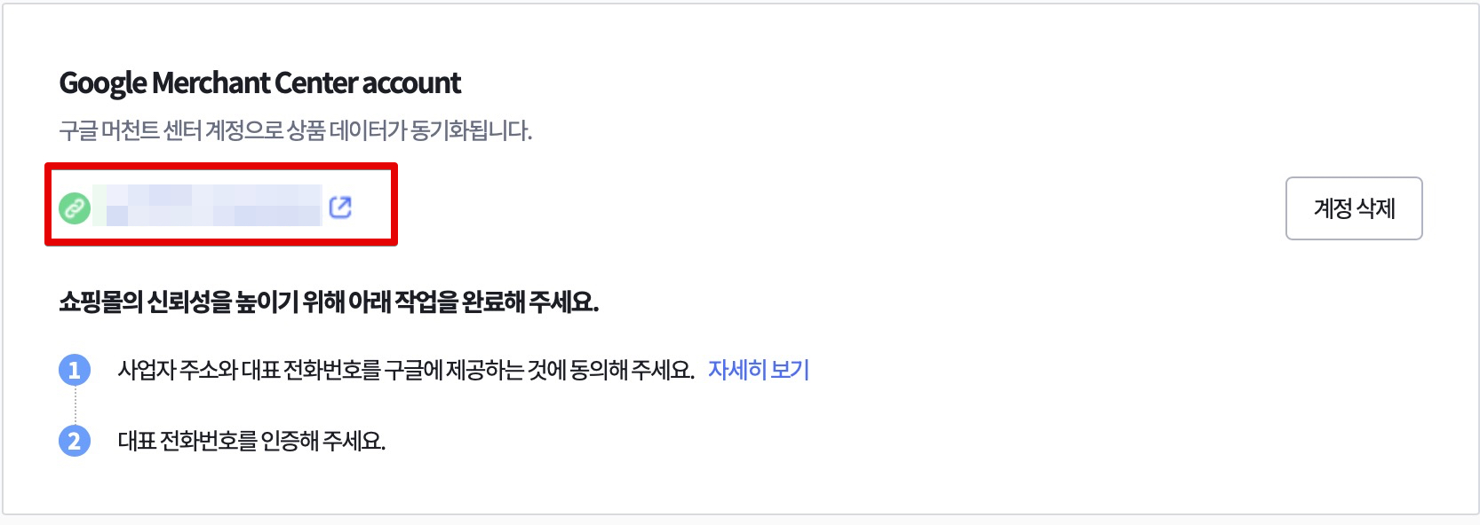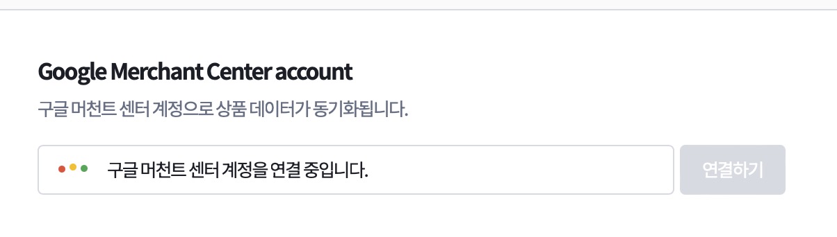 다음으로 구글 머천트센터의 계정을 넣어야하는데요. 여기 계정을 넣게 되면 구글 머천트 센터 계정으로 상품 데이터가 동기화가 되는 방식입니다.