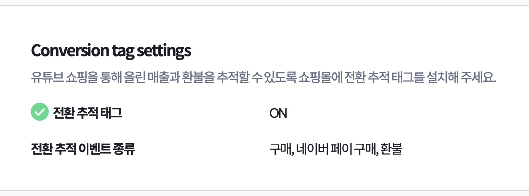 그러면 전환 추적 태그가 ON으로 바뀌게 되며, 전환 추적 이벤트 종류로 구매, 네이버페이 구매, 환불이 추가됩니다.