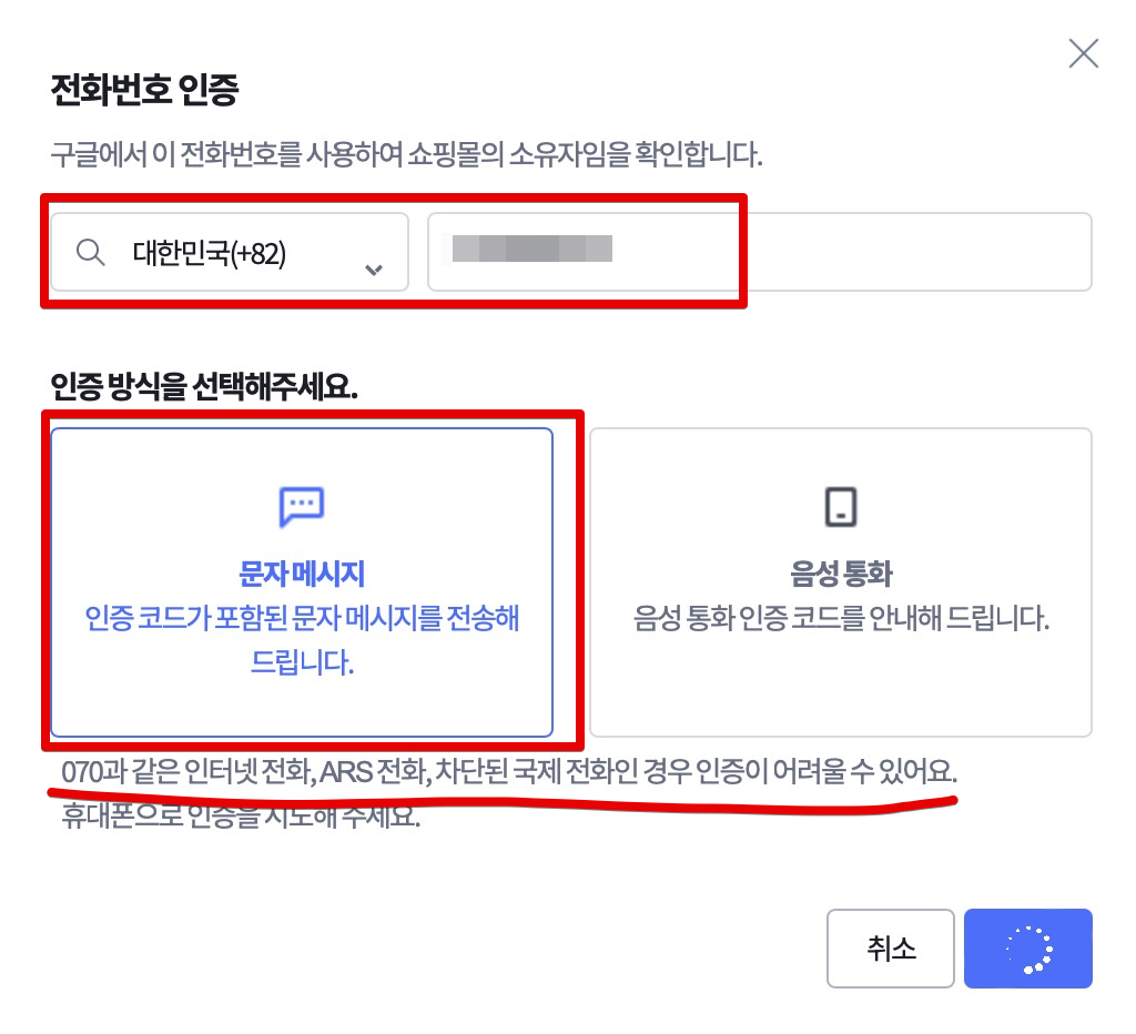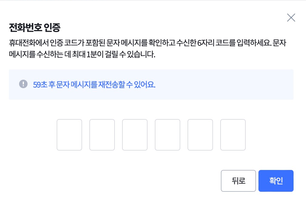 다음으로 전화번호 인증을 해야하는데, 이때 전화번호 인증은 문자메시지로 하시면 되는데요. 이전에 050 전화번호를 입력해보니까 문자가 안오더라고요. 그래서 실제로 사용하는 (010) 번호를 이용하여 문자메시지로 인증 과정을 거쳐주시면 됩니다.