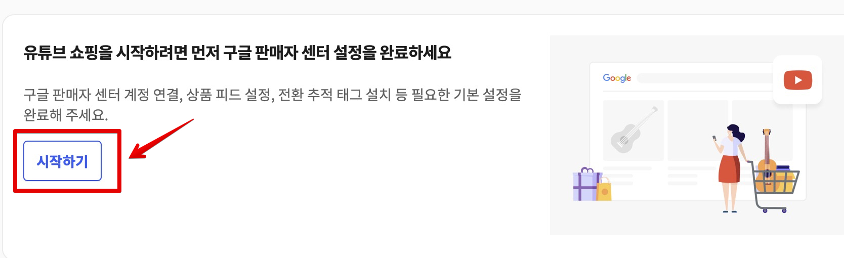 다시 카페24 쇼핑몰 관리자 페이지로 들어오게 되면, 이제 아래쪽에 구글 판매자 센터 설정을 완료하기 위해서 [시작하기]를 클릭합니다.