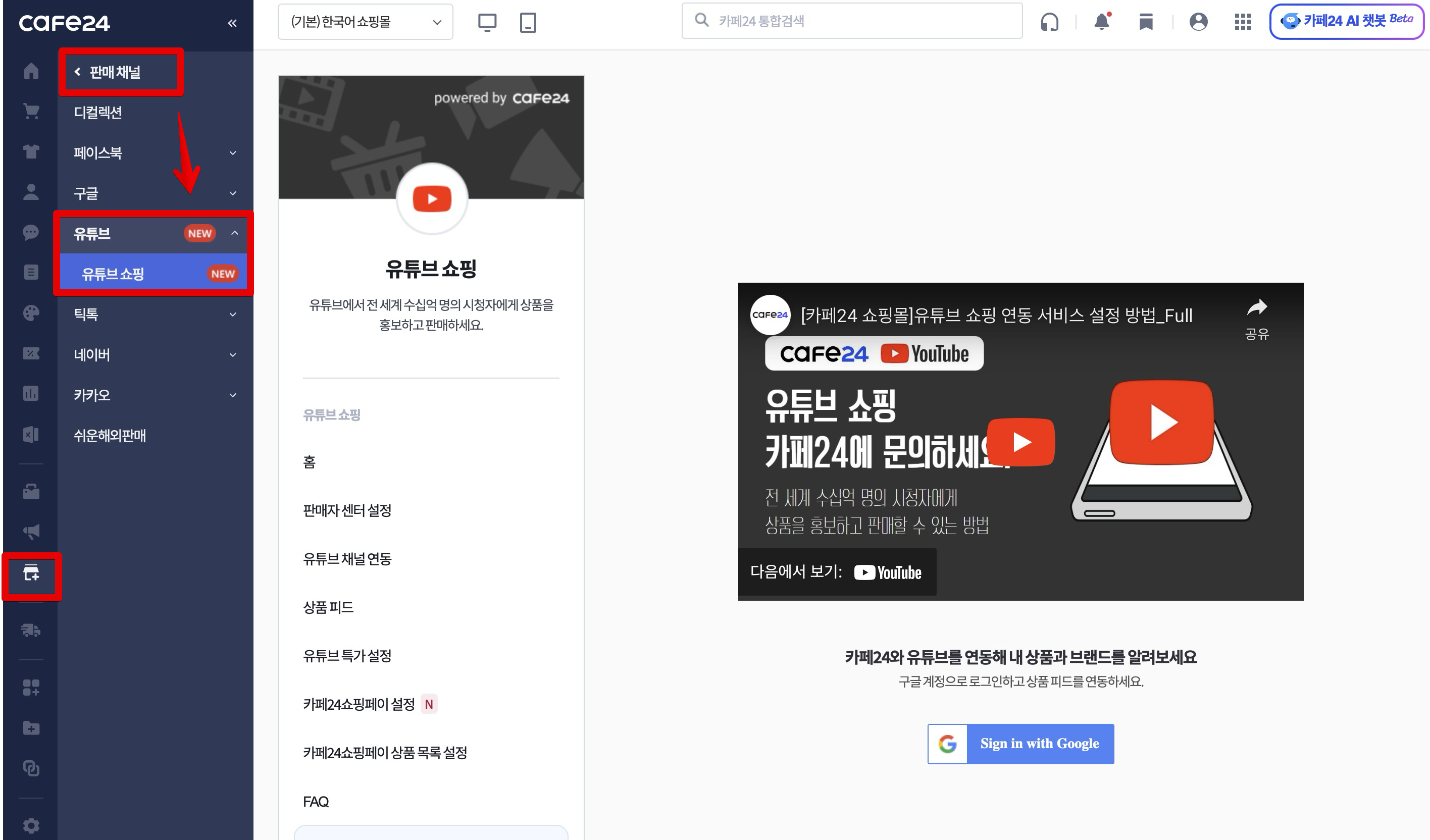 이제 드디어 카페24 쇼핑몰을 만들 때 여러가지 기초 설정들과 필수 설정들을 마치고 유튜브 쇼핑에 상품을 등록하고 유튜브 채널과 쇼핑몰을 연동할 시간입니다. 제일 먼저 카페24 쇼핑몰 관리자 페이지에서 [판매 채널] - [유튜브] - [유튜브 쇼핑]으로 들어가줍니다. 그런 다음 구글 로그인을 해줍니다.