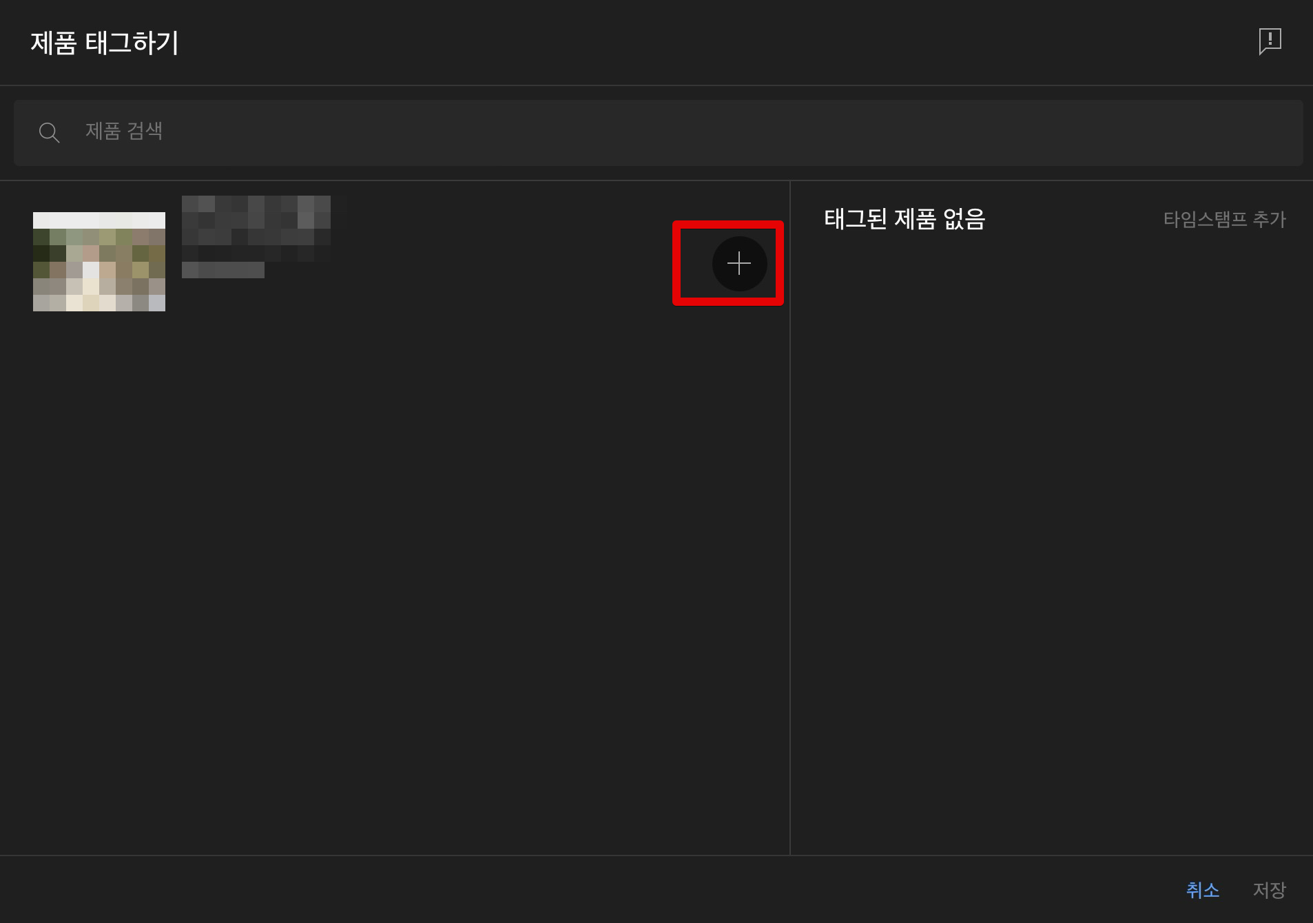 제품 태그하기 화면이 나오고 여기에서 내가 등록한 제품이 나타납니다. 오른쪽에 더하기 버튼(+)을 클릭합니다.