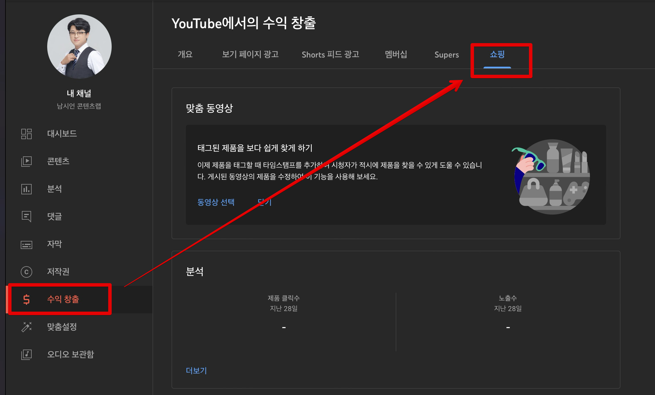 제일 먼저 [유튜브 스튜디오]로 들어간 다음 [수익 창출] 메뉴에서 [쇼핑]탭으로 들어갑니다.