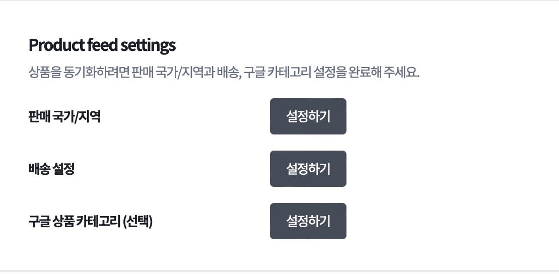 판매 국가/지역, 배송 설정, 구글 상품 카테고리 등을 설정해주면 됩니다.