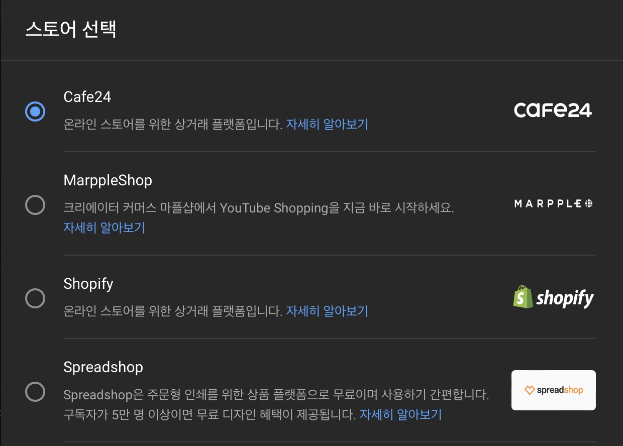 이제 유튜브 채널에서 유튜브 쇼핑 기능을 통해 카페24 쇼핑몰에서 상품을 등록해줍니다.