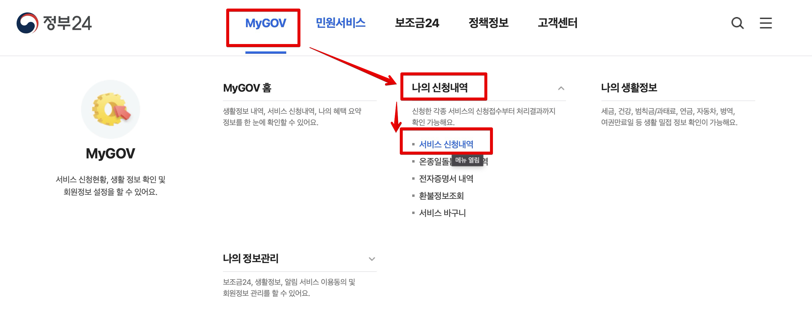 정부24 사이트에서 제일 위에 있는 [MyGOV]에서 [나의 신청내역]에서 [서비스 신청내역]으로 들어갑니다.