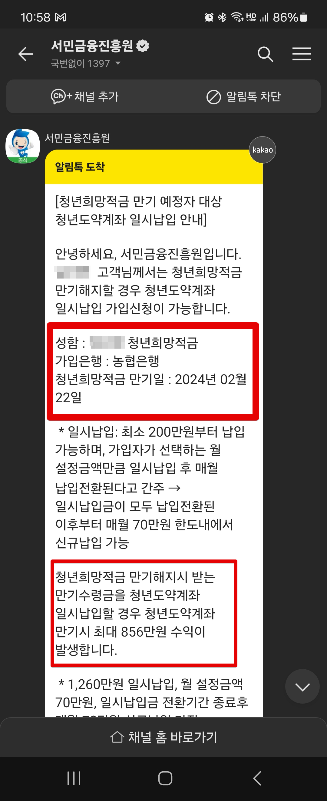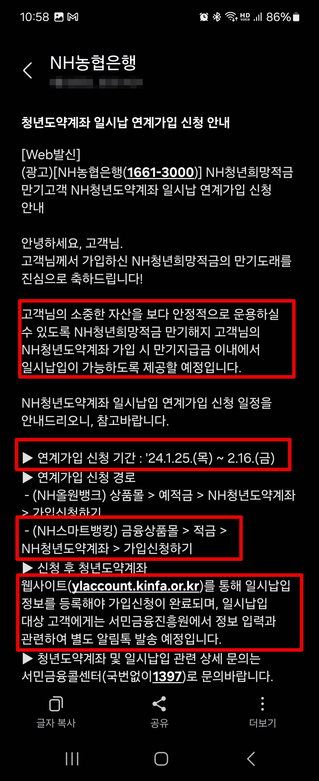 아마 청년희망적금 2월에 만기되시는분들의 경우 저처럼 청년희망적금 가입한 은행(저는 NH농협은행)과 서민금융진흥원에서 알림톡을 받으셨을거에요. 이번 글 아래에서 후술하겠지만, 일단은 청년희망적금 청년도약계좌 연계가입 신청 문자를 받으셨다면, 무조건 가입신청부터 하고 고민해보시기 바랍니다. 가입신청을 한 뒤에도 나중에 생각이 바뀌면 청년도약계좌 계좌개설을 하지 않아도 되며, 가입한다고 하더라도 소액으로만 가입하면 가입 안한것과 똑같은 효과를 낼 수 있습니다. 그러니까 가입신청 안했다가 나중에 후회하느니 일단은 먼저 가입해놓고 나중에 고민해보는게 훨씬 유리합니다.
