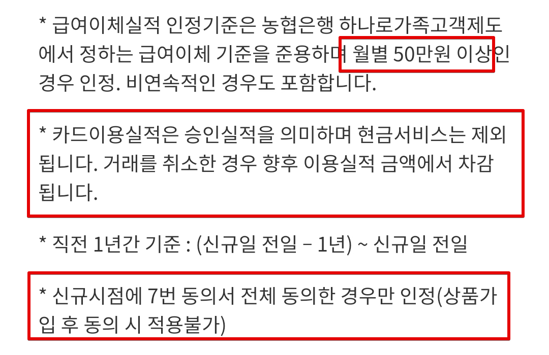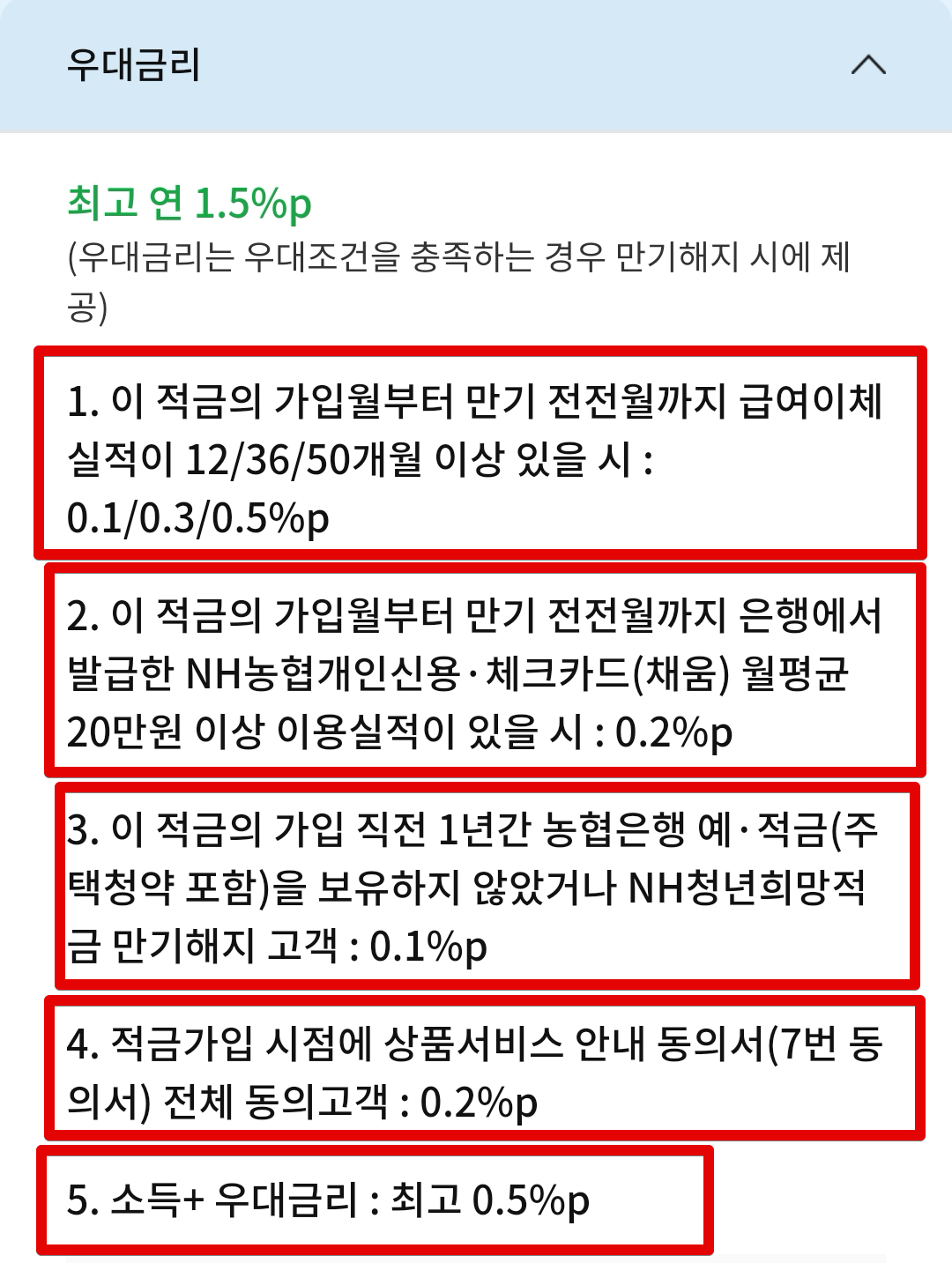 - 소득+우대금리 : 이 부분은 소득에 따른 우대금리이므로 꼭 NH농협을 이용할 필요는 없습니다.