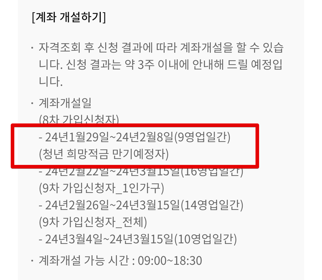 청년희망적금 만기예정자 사전신청 기간은 24년 1월 25일부터 2월 2일까지 7영업일간입니다. 이 기간안에 사전신청해야합니다. 계좌개설일은 1월 29일부터 2월 8일까지 9영업일간인데, 만약 가입하실분들이라면 이자를 하루라도 더 챙기기 위해서 미루지말고 가입하는걸 권장합니다.