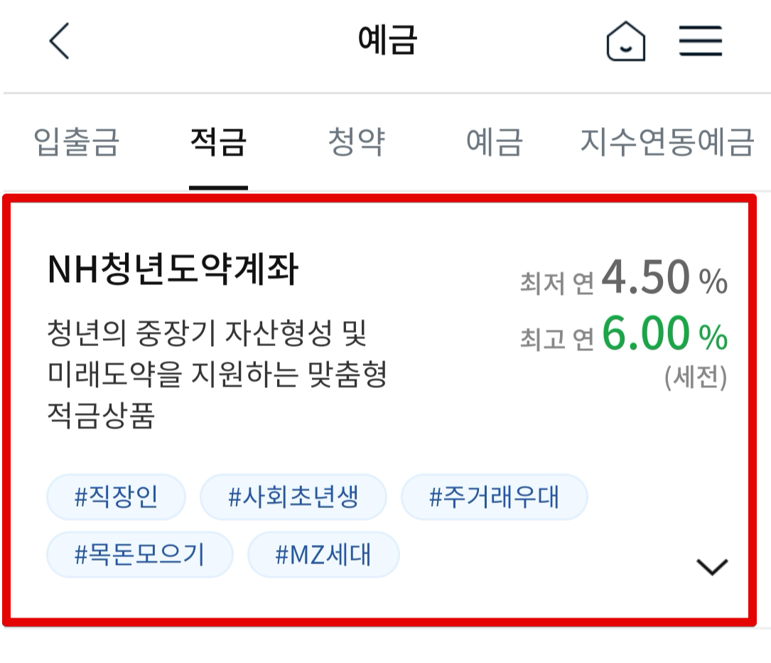 적금 항목 제일 위에 NH청년도약계좌 라는 이름으로 상품이 나와있는데 여길 클릭해주면 됩니다. 기본금리 4.5%로 준수하고 비과세 상품이라서 좋은 상품입니다. 최대치 6% 금리인데 소득기준 등을 모두 맞춰서해서 이 부분은 좀 까다롭습니다.