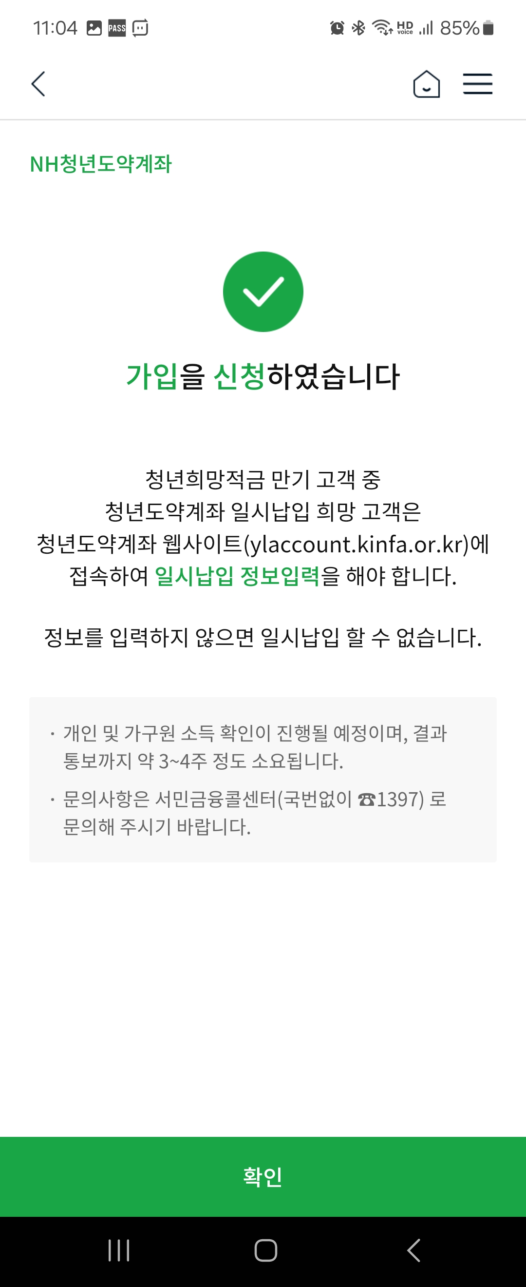 일단 가입신청을 한 후에 가입대상일 경우에만 서민금융진흥원에서 일시납입 정보입력 기간에 대한 일정을 알림톡이나 문자 등으로 안내해준다고 합니다. 따라서 지금 청년희망적금 만기 직전이고, 청년도약계좌로 갈아타실 생각이 있으신분들이라면, 일단 가입신청 후(은행 앱에서 가입신청), 알림톡을 기다리면 되겠습니다.