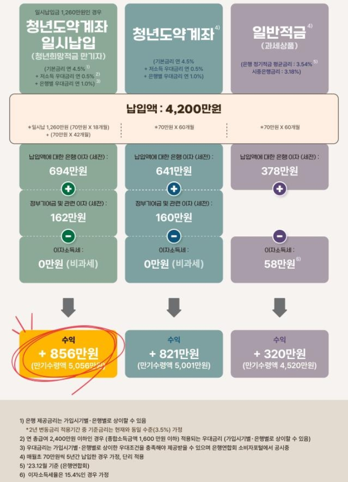 따라서, 단순 계산으로도 만약 청년희망적금을 만기 해지하고 청년도약계좌를 따로 또 개별적으로 가입하는 것보다, 일시납입해서 거치해두는게 이자측면에서 유리합니다.