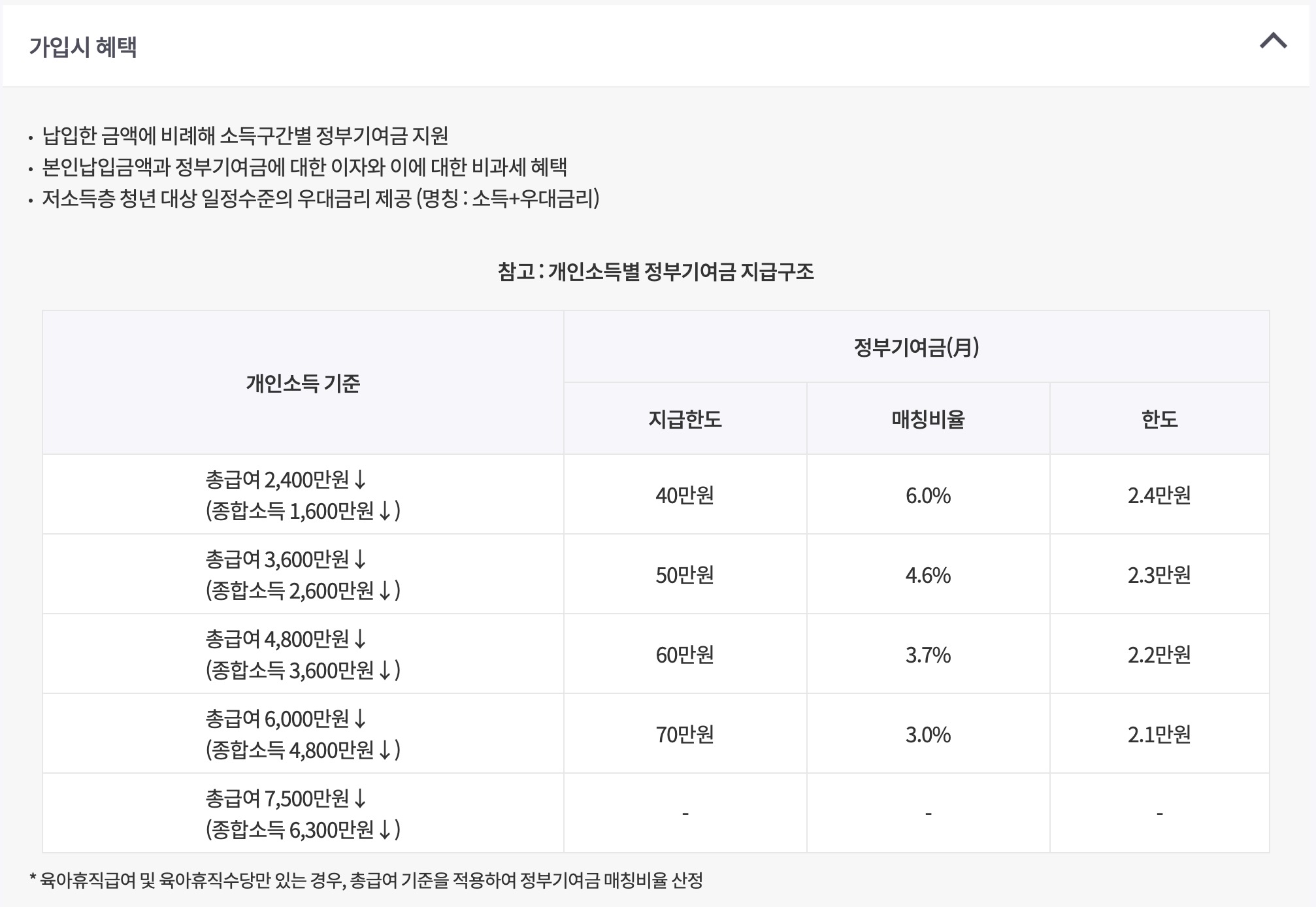 매칭율이 뭐냐면, 예를들어 매칭율 6%라면, 월 납입 금액의 6%를 받을 수 있다는 의미입니다. 70만원의 6%는 42,000원인데, 최대한도가 정해져 있어서 최대한도는 70만원일 경우 2.1만원입니다.