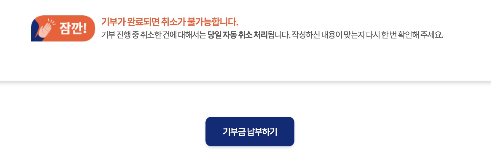 기부가 완료되면 취소가 불가능하다는 안내를 확인한 후 아래쪽에 있는 [기부금 납부하기]클릭합니다.