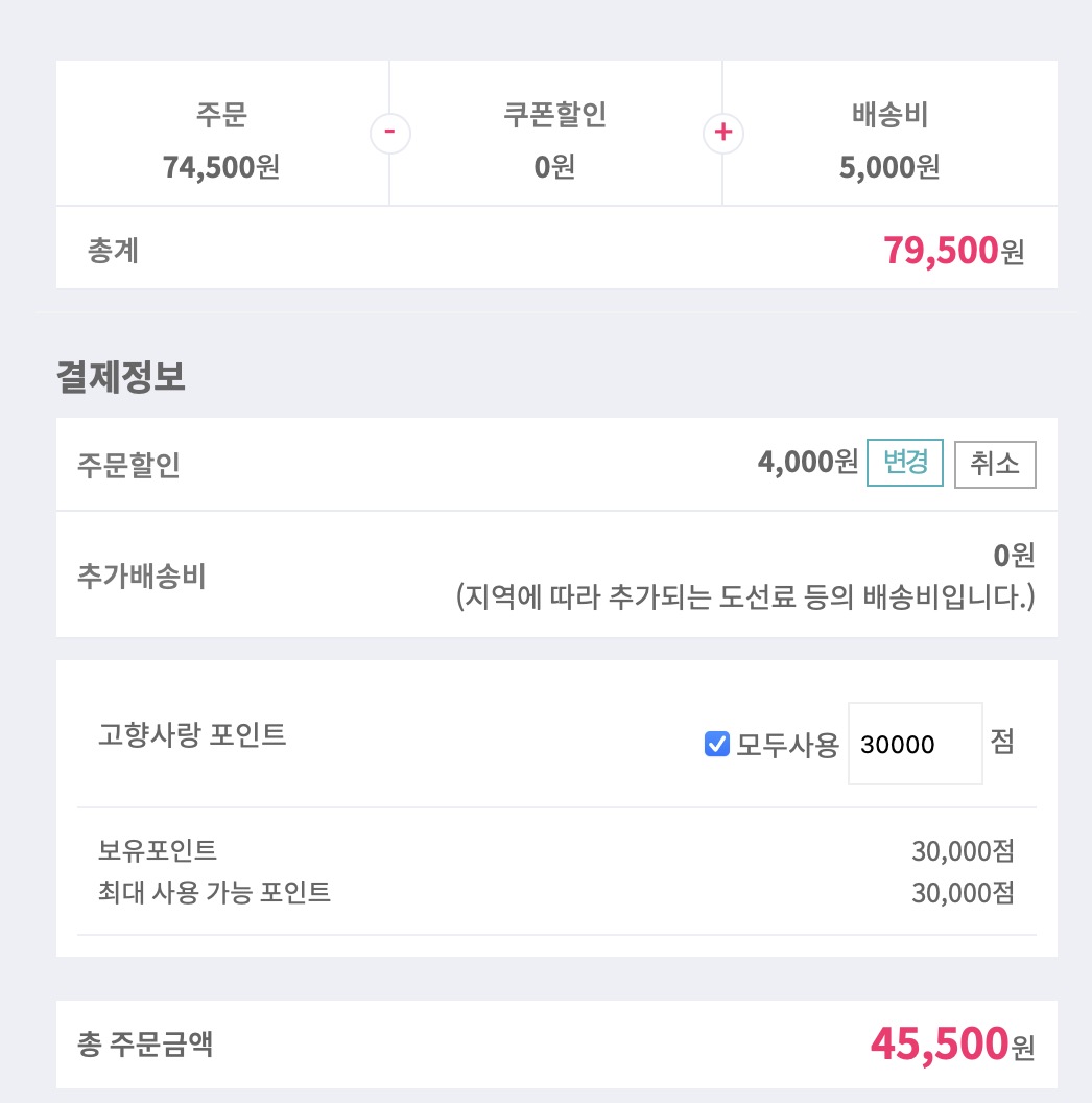 총 79,500원 어치의 상품을 주문하였고 쿠폰 할인으로 4,000원 할인 + 고향사랑포인트로 3만 포인트를 사용하여서 최종 결제 금액 45,500원으로 추가금을 결제합니다.