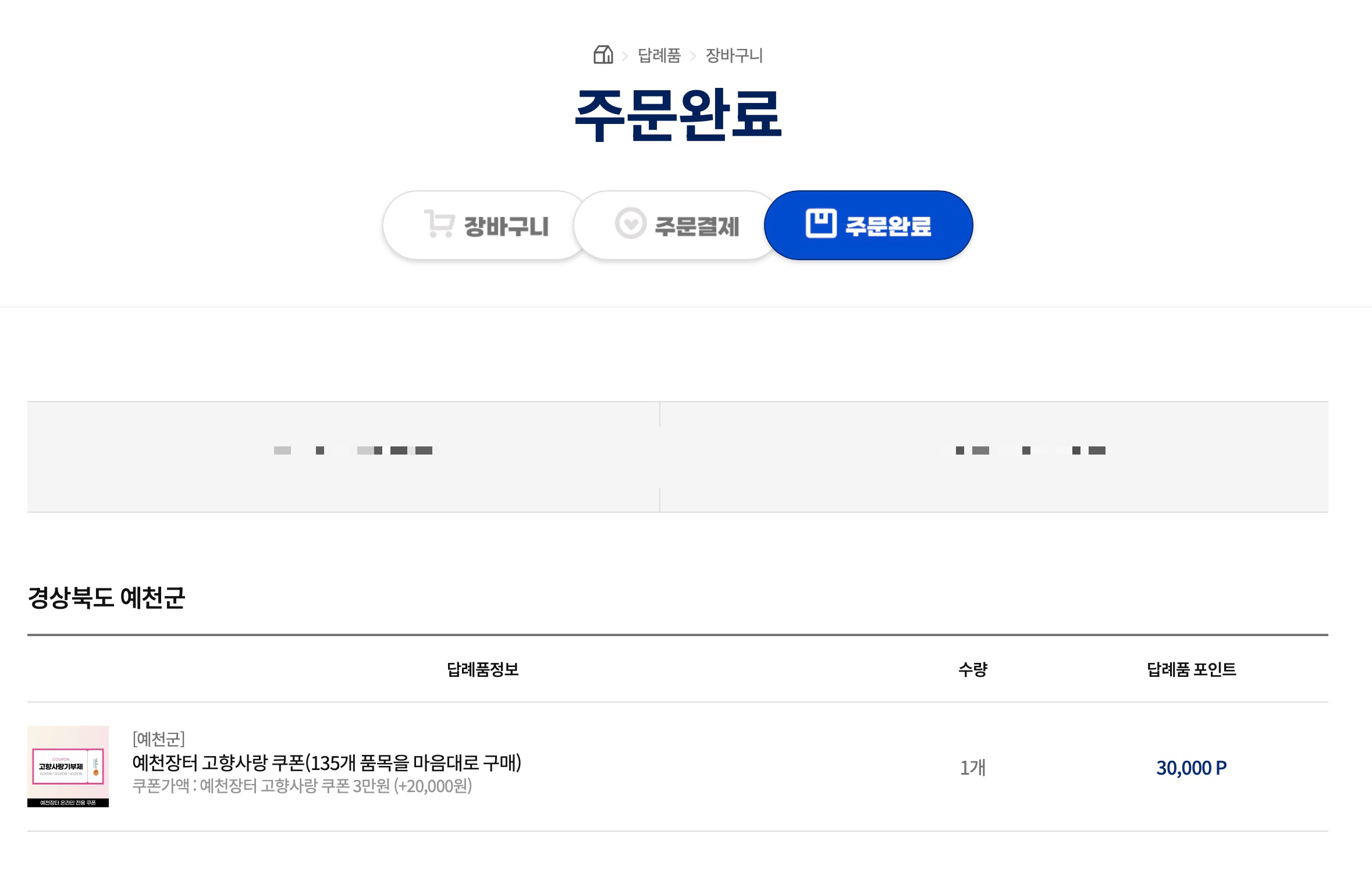 이렇게 3만 포인트로 예천장터 고향사랑 쿠폰을 3만원어치를 구매하면 됩니다.