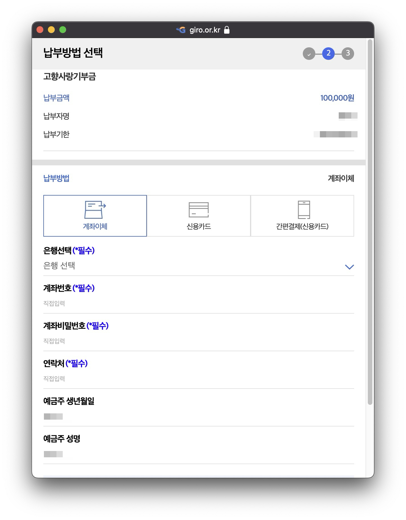 인터넷 지로창이 나오면 계좌이체나 신용카드 등으로 납부가 가능한데, 저는 보통 국세/지방세/기부금 모두를 결제할 때 계좌이체만을 사용합니다.